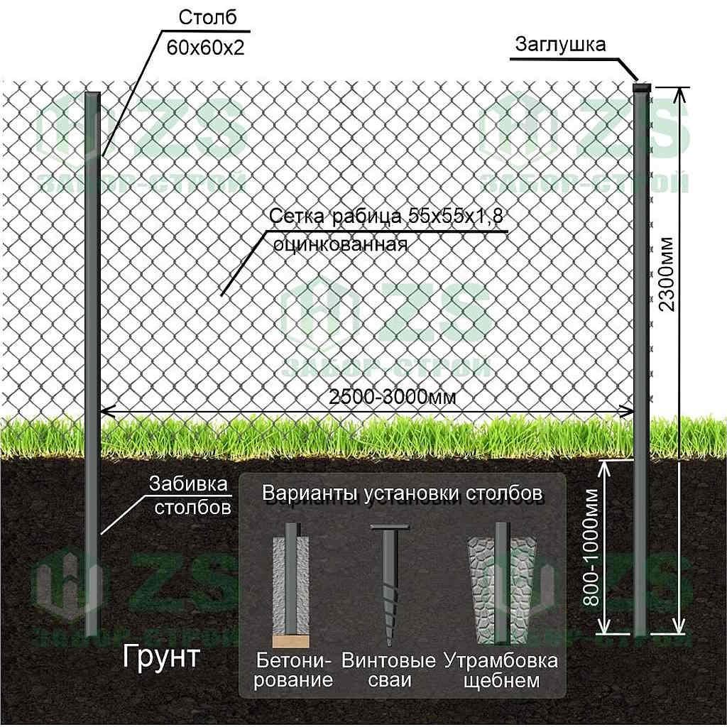 Конструкция забора из сетки рабицы: